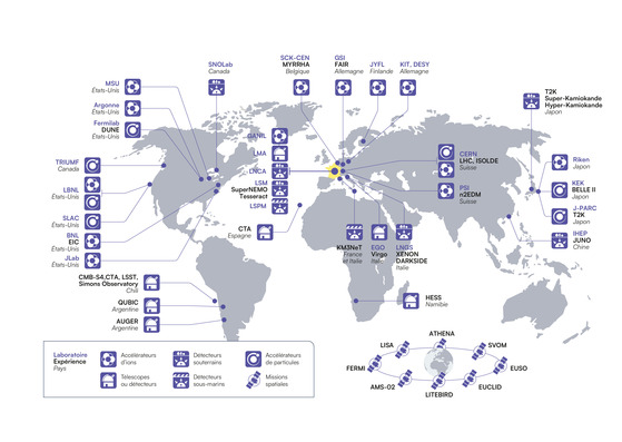 Planisphère des grands projets de recherche internationaux de CNRS Nucléaire & Particules
